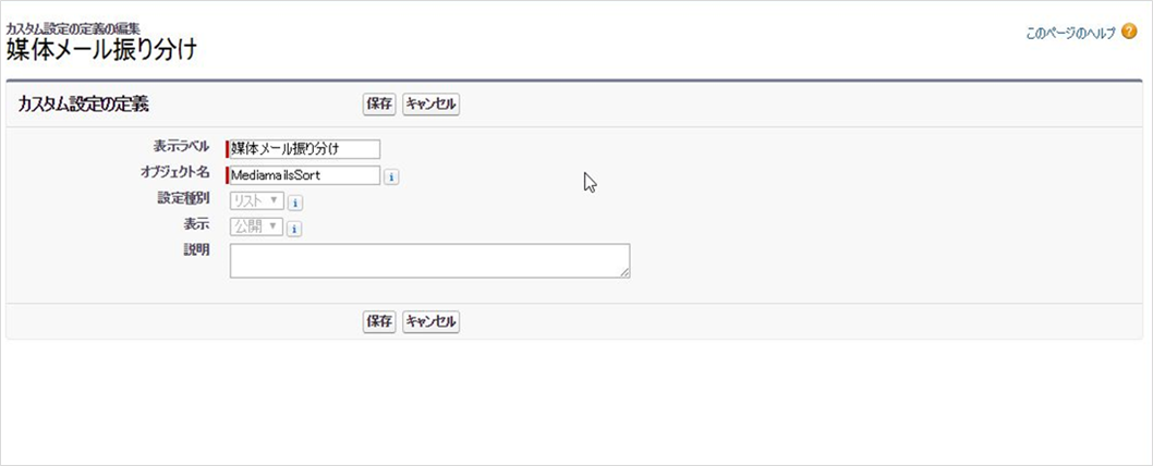 手順① カスタム設定の定義(Salesforce画面のメニューから 設定 > 開発 > カスタム設定 > 新規ボタン)