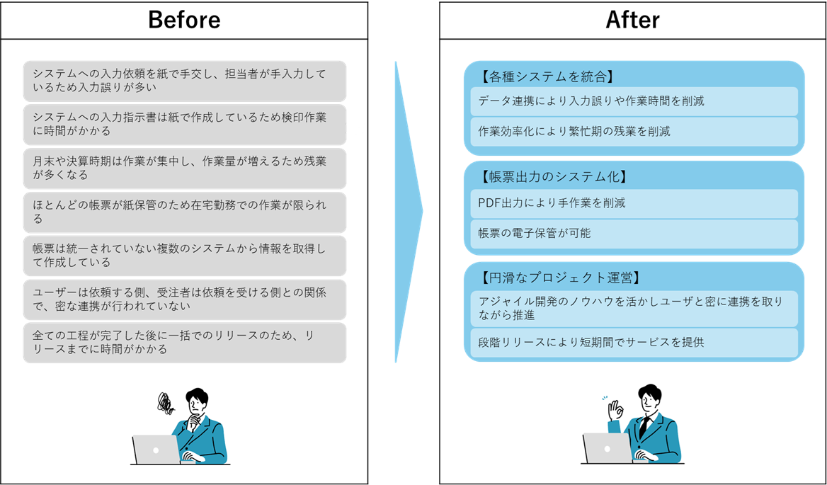 これまでのアジャイル開発のノウハウを活かし、ユーザーと密に連携してプロジェクトを推進した結果、円滑な運営が実現し、お客様から高い評価をいただきました。また、スクラムを活用してフェーズを分けた段階リリースを行うことで、利用頻度の高い業務に対して短期間でサービスを提供することができました。