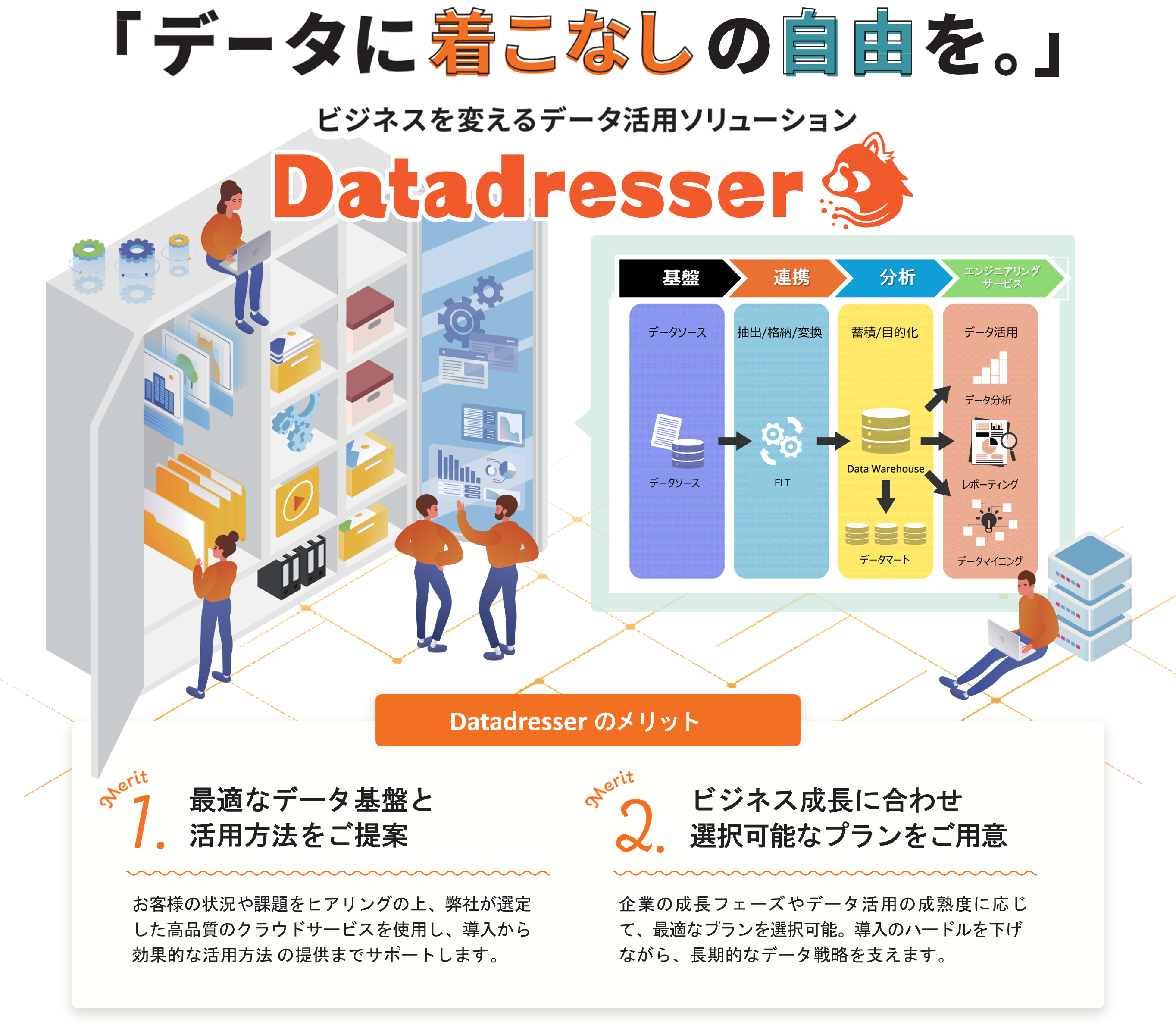 柔軟でスケーラブルなデータ活用基盤構築ソリューション「Datadresser」で、ビジネスの成長を加速させましょう。
