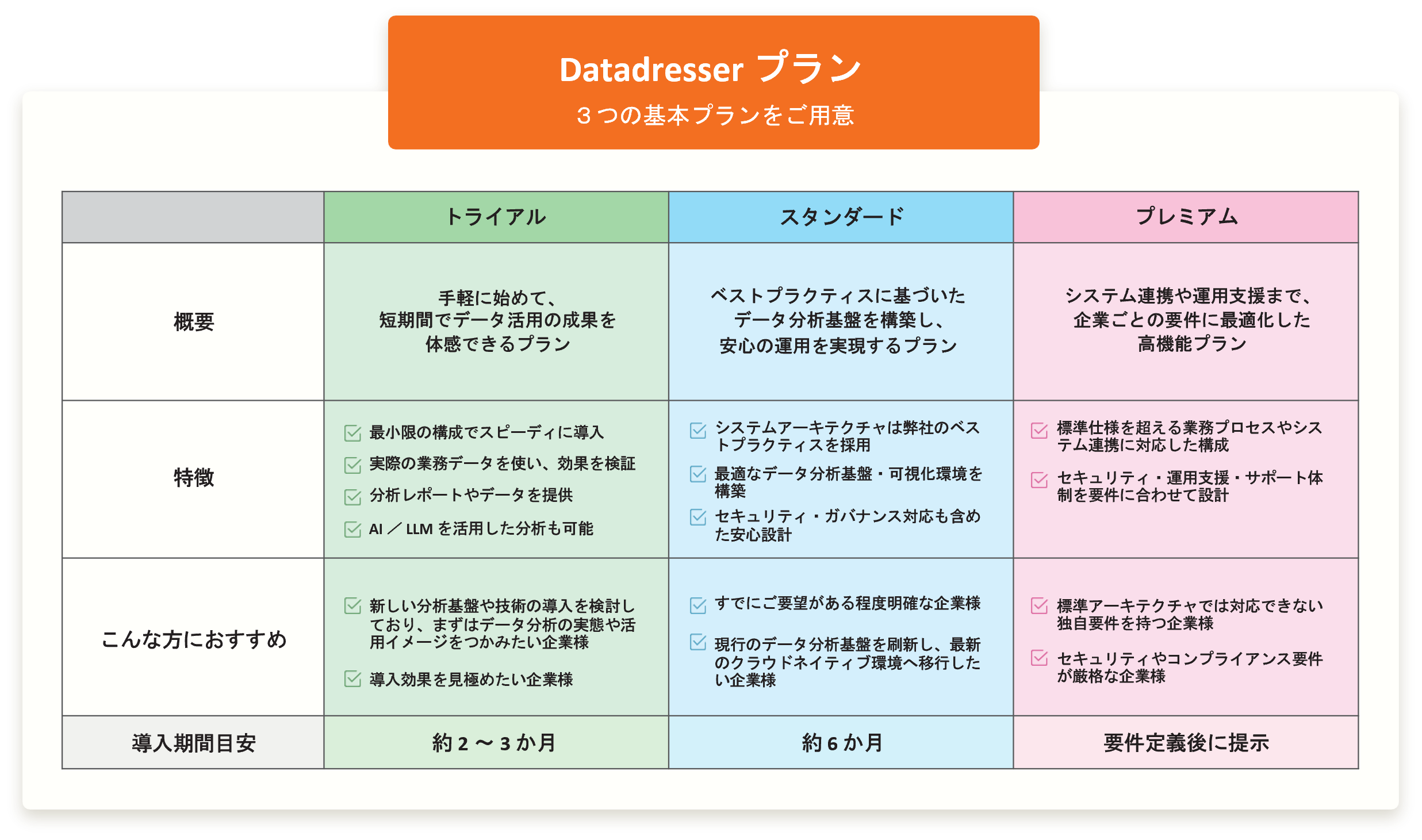 Datadresserでは、「まずは試す」から「本格運用」まで、無理なく拡張できるプラン体系をご用意しています。